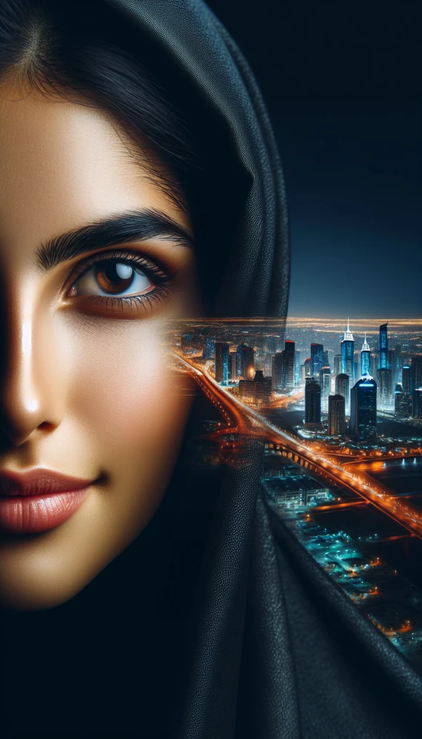 Close-up of a young woman's face, where the left side of the face blends into a picturesque landscape. Landscape characteristicsa city at night with its lights and its buildings. The person's eye is particularly detailed, with a reflective quality, and it appears to be looking into the distance. The overall mood of the image is one of tranquility and connection with the city., poster, cinematic