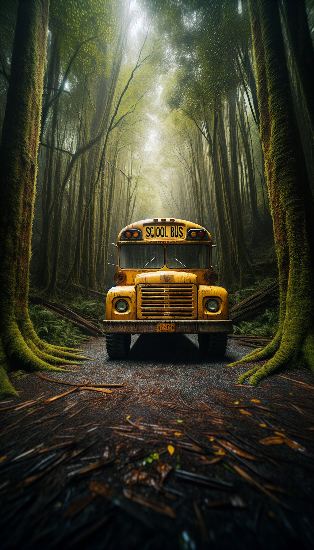 Old yellow school bus real photo from the front in the forest ultra realistic, cinematic, poster