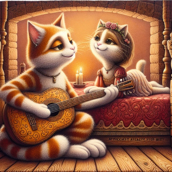 Un chef-d'œuvre visuel captivant et charmant à long plan du talentueux artiste Boobba, mettant en vedette un chat Roméo faisant une sérénade à sa petite amie, Juliette, dans un style artistique naïf. Le chat Roméo est parfaitement détaillé, avec une guitare dans les pattes, alors qu'il regarde avec amour sa Juliette, nichée dans un coin douillet. L’arrière-plan est rempli de teintes douces et chaleureuses, créant un sentiment d’intimité et de romantisme. La signature de l'artiste est visible dans le coin inférieur droit, ajoutant une touche d'authenticité à cette scène enchanteresse.