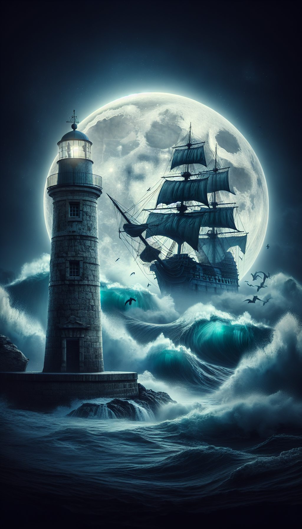 Sous une pleine lune imminente, un phare altéré se dresse résolument sur fond de mer agitée.À proximité, un ancien et majestueux galion combat des vagues imposantes, ses voiles en lambeaux mais provocantes. La scène, un mélange de tranquillité étrange et de puissance maritime brute, évoque des histoires de trésors perdus et de marins spectraux naviguant dans la fureur de la nature. Quels secrets le gardien du phare et le navire fantomatique pourraient-ils cacher dans ce drame maritime nocturne ?