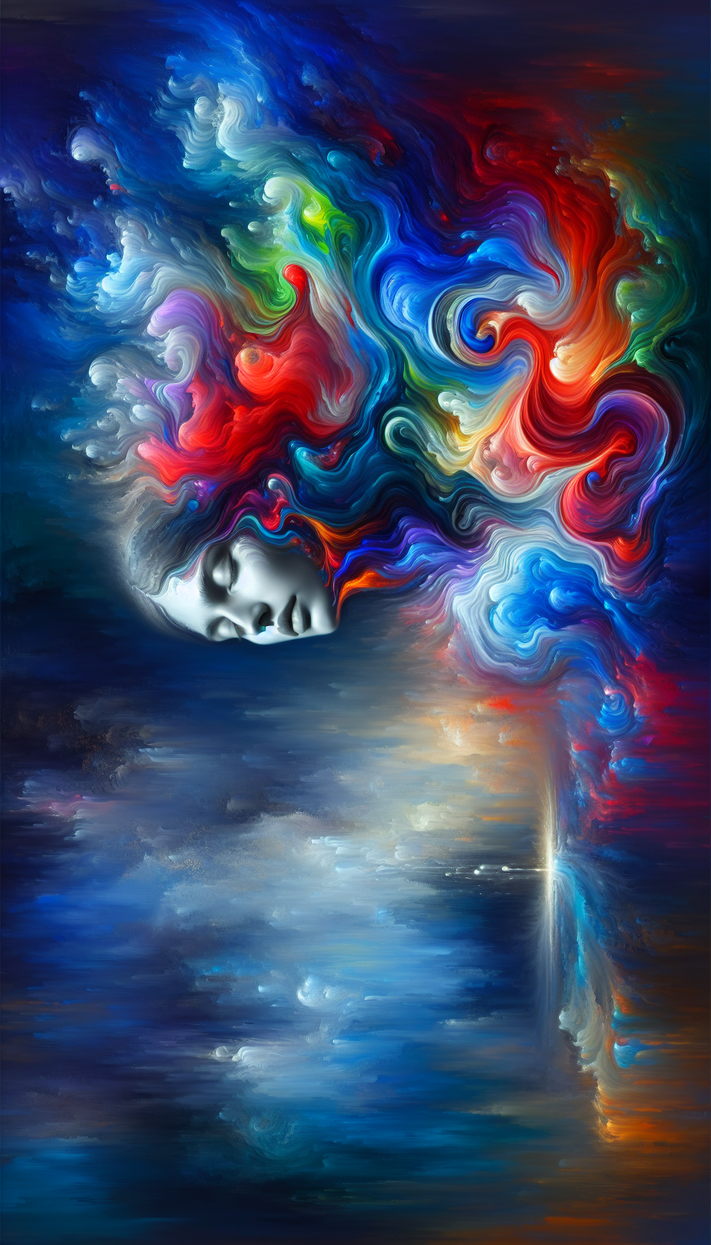 Une peinture à l’huile surréaliste captivante qui capture l’essence d’une femme en profonde transformation. Le sujet se transforme visuellementdans une flaque multicolore fascinante, avec des nuances vibrantes allant des bleus profonds aux rouges ardents, chacune représentant un aspect distinct de sa paix intérieure. Le mélange habile de l'artiste entre le surréaliste et l'émotion crée une atmosphère sereine, attirant les spectateurs dans l'expérience intense du personnage. L'arrière-plan présente un paysage mystérieux et onirique, plongeant davantage le spectateur dans cette scène captivante., tableau