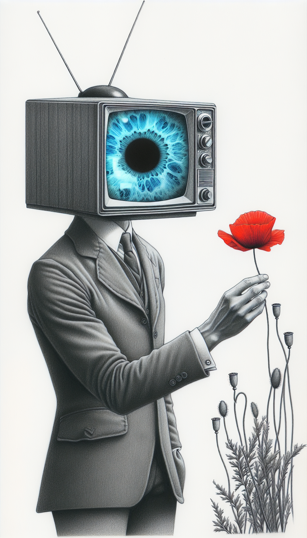 Un dessin au crayon saisissant et minimaliste représentant un homme avec une télévision rétro en guise de tête, à partir de l'épaule. L'écran du téléviseur affiche un oeil bleu et rouge massif et captivant. L’homme, vêtu d’une tenue simple et vintage, cueille délicatement un coquelicot rouge vif dans son jardin méticuleusement entretenu. L'arrière-plan est clairsemé, concentrant l'attention du spectateur sur le personnage central unique et intrigant.