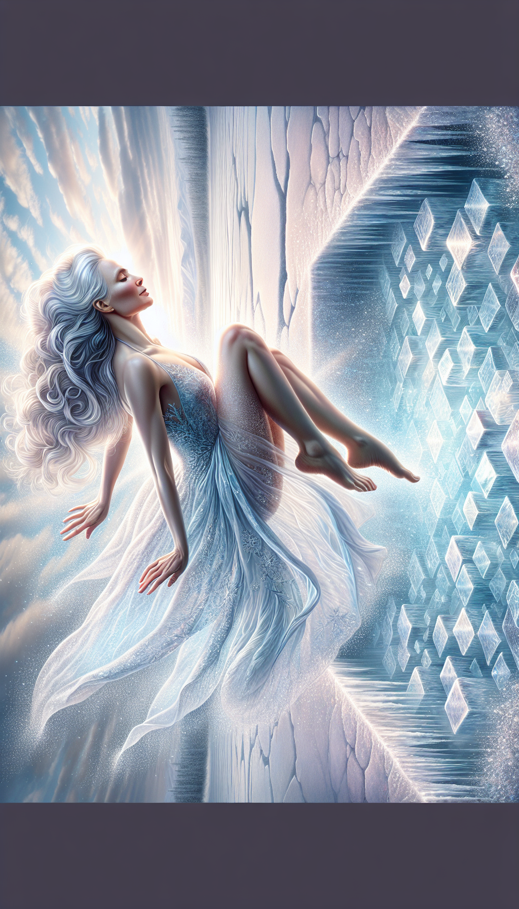 Une illustration accrocheuse et très détaillée d'une femme gracieuse planant dans les airs, prête à sauter méticuleusement dans une piscine à couper le souffle.judicieusement fabriqué à partir de centaines de glaçons scintillants. Elle porte une robe fluide bleu glacier qui tombe doucement en cascade dans l'eau glacée en contrebas, son expression étant un mélange parfait de détermination et de sérénité. L'air autour d'elle scintille d'un givre subtil, tandis que l'arrière-plan révèle un paysage lointain de montagnes enneigées et un ciel rempli de teintes pastel éthérées. La composition est parfaitement équilibrée, mettant en valeur l’interaction captivante de la lumière et de l’ombre dans la scène.