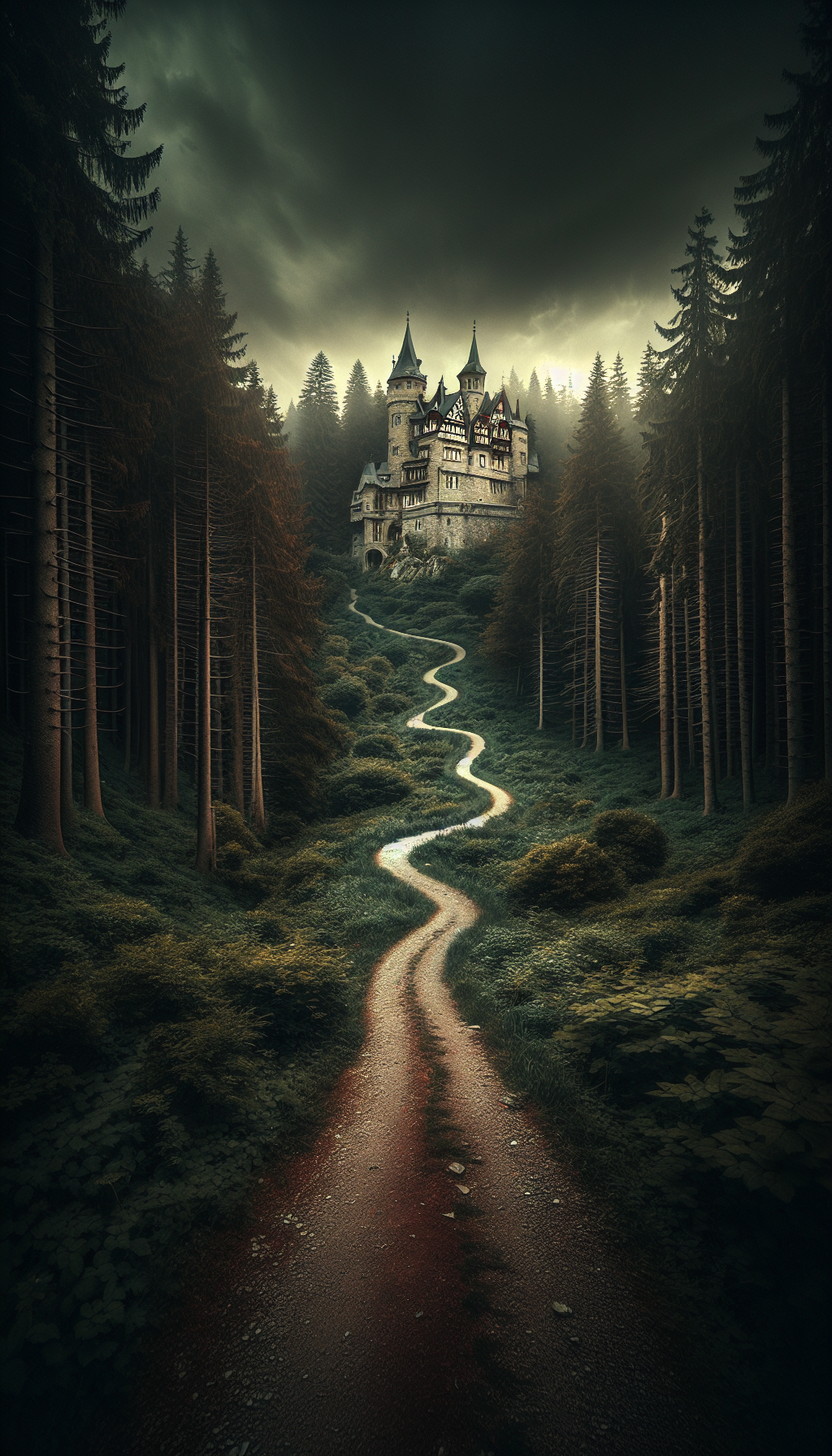 Une photographie cinématographique captivante d'un chemin sinueux qui guide le regard du spectateur à travers une forêt dense et enchanteresse. Le chemin commence dans le coin inférieur de l’image et monte doucement, menant le regard vers une majestueuse maison gothique perchée au sommet d’une colline au loin. La maison est entourée d’un ciel sombre et menaçant et la forêt est remplie de grands arbres tordus, créant une atmosphère inquiétante. Au fur et à mesure que le spectateur suit le chemin, il est immergé dans la beauté envoûtante de la scène., cinématique