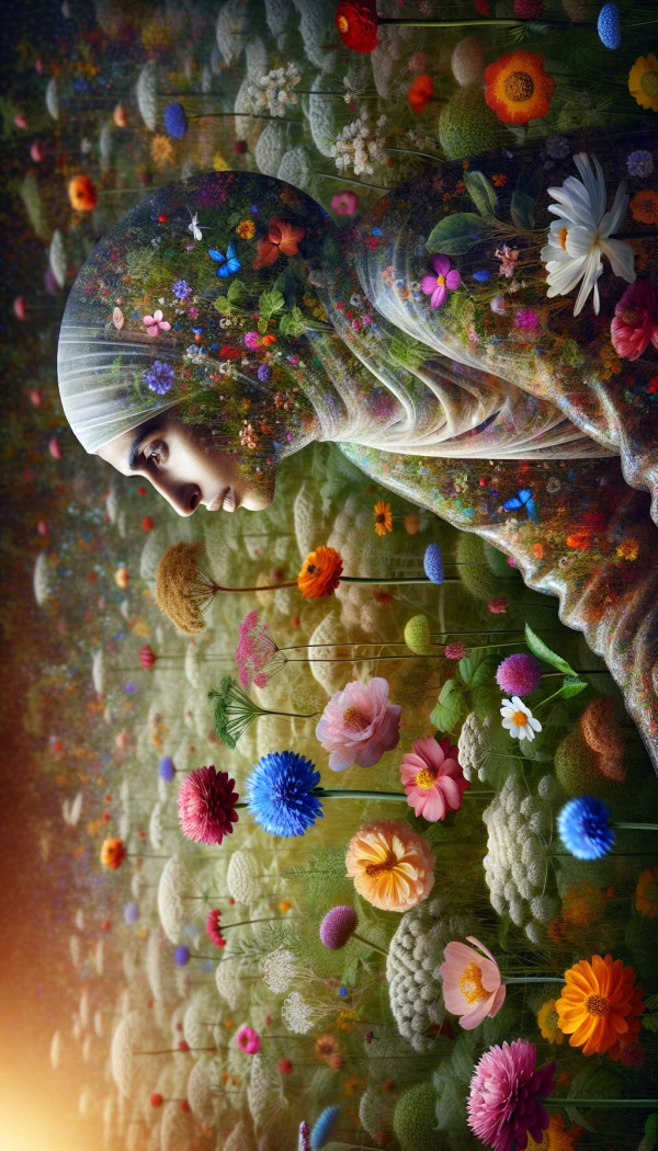 Masterpiece photo, woman body like a transparent resin glass, flowers floating inside the body, in a field filled with flowers, dream, spiritual, deep breathing