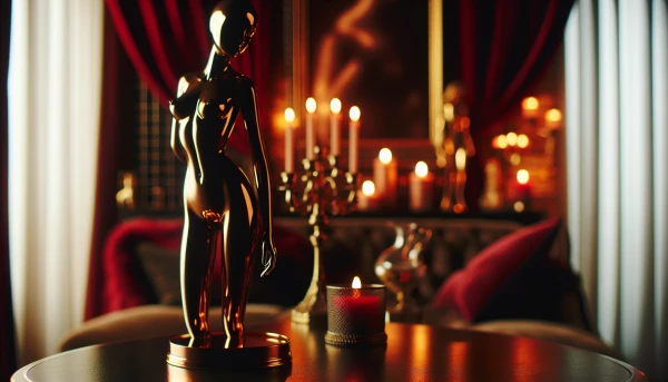 restant élégante. L'ambiance est luxueuse et intime, avec des tons chauds de rouge profond et d'or. En arrière-plan flou, on devine un intérieur chic avec des rideaux de velours et des bougies. L'image évoque le mystère, la séduction et le raffinement sans être explicite.