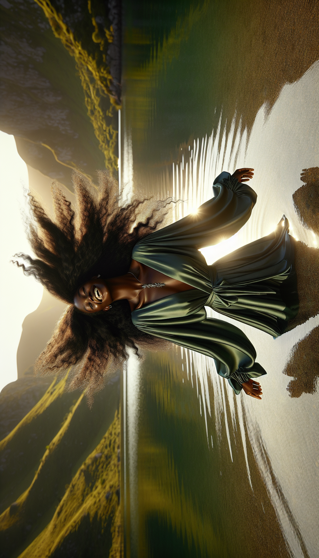 A stunning photograph capturing a moment of pure bliss, with a woman standing waist-deep in a serene, shimmering lake. Her long, unbound hair dances playfully in the warm, golden sunlight, framing her radiant smile. The woman is dressed in an exquisite, flowing green gown that blends seamlessly with the lush green hills in the background, which are illuminated by the same gentle sunlight. A delicate necklace adorns her neck, adding a touch of elegance to the scene., photo