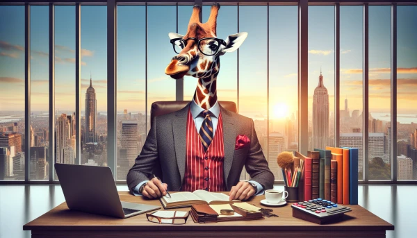 A whimsical and amusing image of a giraffe wearing a banker's suit, complete with a red vest, striped tie, and a pair of glasses. The giraffe is standing in an office setting with various books, a laptop, and a cup of coffee on its desk. The background reveals a city skyline and a sun setting over the horizon. The overall atmosphere is that of a quirky and surreal office scene.