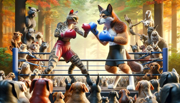 A stunningly realistic 8K image of an anthropomorphic cat and dog engaged in a fierce boxing match. The cat, wearing red boxing gloves, is poised to strike, while the dog, wearing blue gloves, focuses intently. The background is a lush forest, alive with the vibrant colors of autumn, where dogs and cats bet on the outcome of the match. Spectating animals, with various expressions of anticipation and excitement, line the sidelines. The image is rendered in 3D, with a cinematic feel, capturing the essence of an epic battle between two fierce opponents., cinematic, photo, illustration, 3d render, vibrant