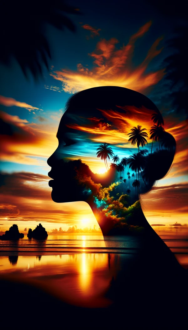 A striking silhouette of a sultry woman's profile, juxtaposed against a mesmerizing sunset that sets the sky ablaze with warm, golden hues. Her silhouette reveals a captivating scene of a tranquil beach at sunset, complete with swaying palm trees and rugged rock formations. The sun's shimmering reflection dances playfully on the calm waters below, creating a mesmerizing mirror effect. The dark fantasy theme is accentuated by the vibrant colors and the woman's mysterious presence, evoking feelings of tranquility, introspection, and a deep connection with nature., vibrant, dark fantasy