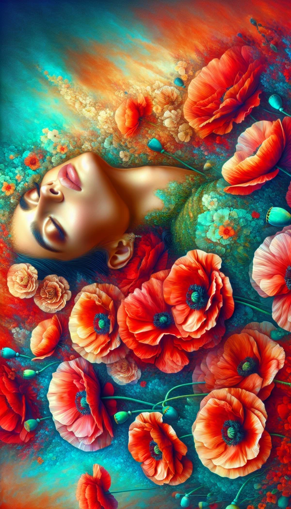 A mesmerizing painting capturing a woman in a dreamlike state, her eyes closed as she is surrounded by a sea of vibrant red poppy flowers. The intricate details of the flowers range from translucent to opaque shades of orange and red, creating a captivating contrast. The woman's attire seamlessly integrates with the flowers, giving her an ethereal presence that blurs the line between reality and fantasy. The background artfully combines turquoise and teal hues, creating a surreal atmosphere that melds fashion and surrealism into one striking masterpiece. vibrant, fashion, painting