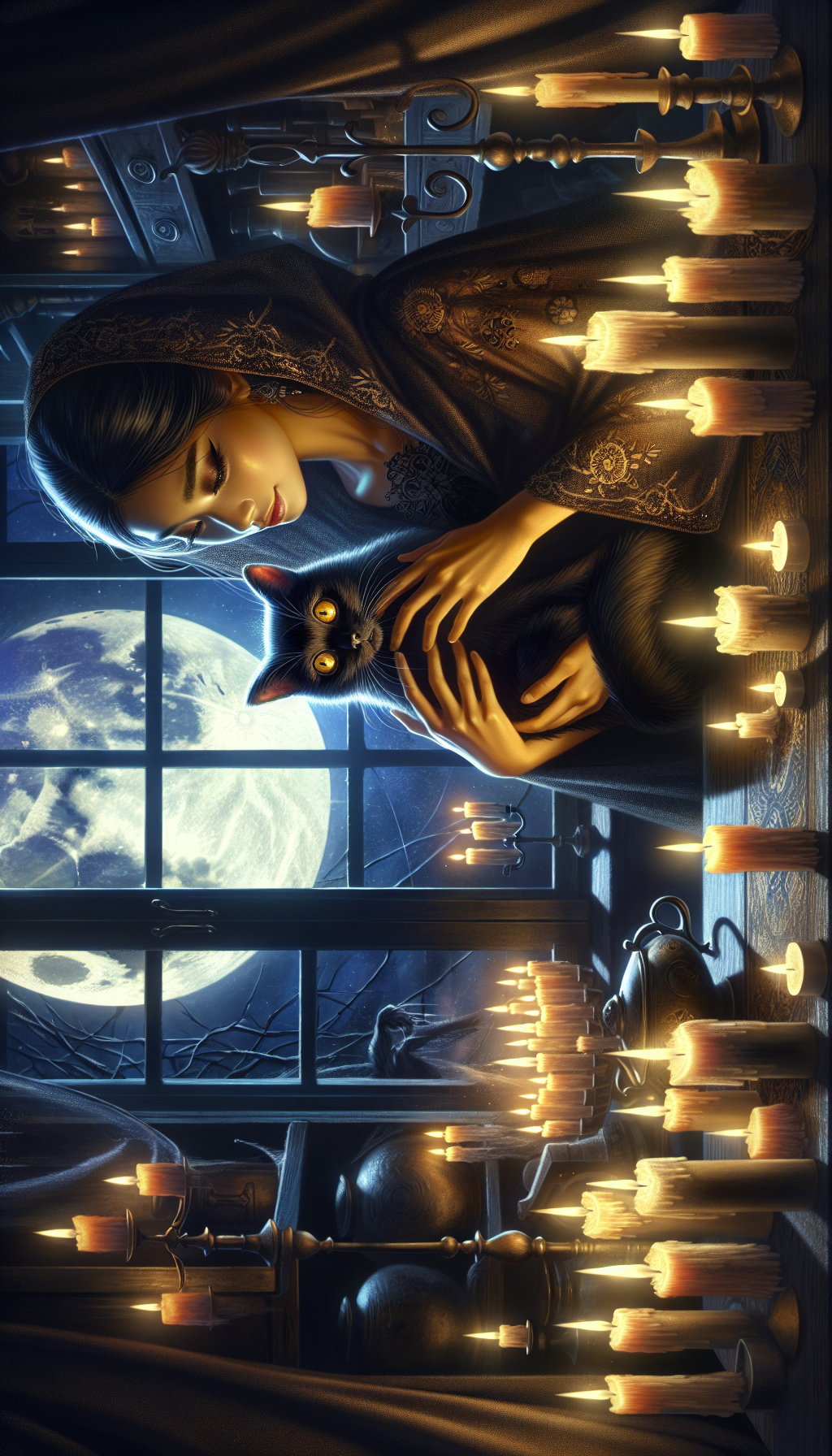 A stunning illustration of a mysterious woman holding a captivating black cat in a dimly lit room. The woman's hands delicately cradle the cat, which has piercing yellow eyes and a flowing, dark cape. The room is filled with candles, casting eerie shadows on the walls. A full moon can be seen through a window, adding a touch of enchantment to the scene.